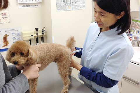 狂犬病予防注射は、3か月齢を過ぎた犬が受けなければいけないという法律があり、1年に1回の接種が義務づけられています。1年中いつでも受けることができますが、世田谷区では4月に定期狂犬病予防接種期間を設けています。登録を済ませている方であれば、その期間に限り済票の発行を病院内でいたします。登録を済ませていない方、またその期間以外に接種された方は、病院で発行する予防接種証明書を保健所または出張所に提出して、手続きをしてください。混合ワクチンを接種する場合は、1か月間隔を空けていただくことをお勧めします。